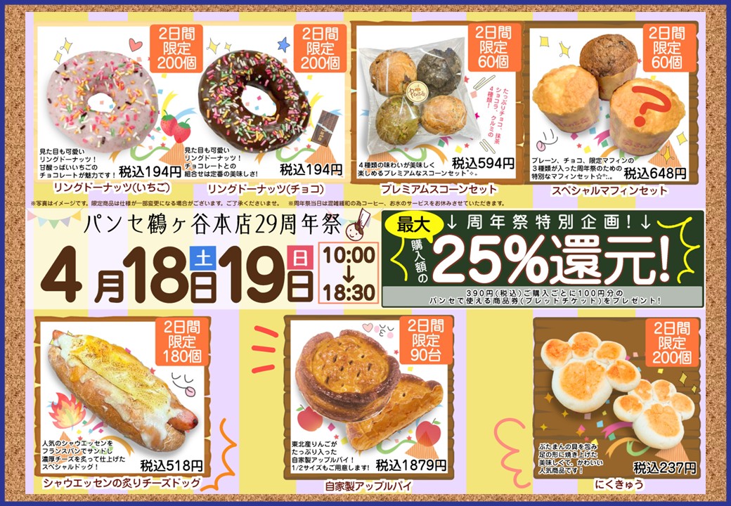 4月18日(土)〜19日(日) パンセ鶴ケ谷店「29周年祭」を開催します